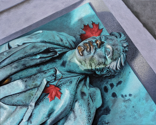 16x20 acrylic on canvas, 2024Having found no account of where the bullet hit, we'll leave it to the leaves.