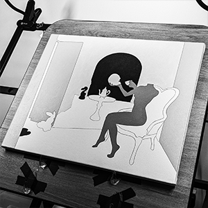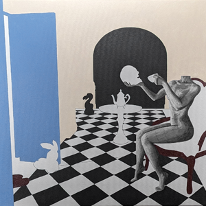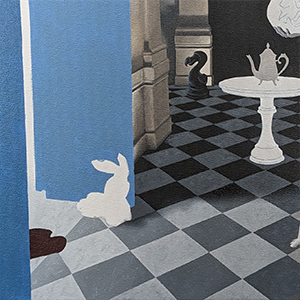 Krystal is deep in the rabbit-hole of realizing her next piece: a self-reflective scene themed after Lewis Carroll's Alice's Adventures in Wonderland and Through the Looking-Glass. This work sees the return of Krystal's “main character” previously seen in Hush—a headless female figure holding a skull, a traumatized being that the viewer may see as defeated or victorious, while at once surreal and perhaps relatable—this time, in the role of an adult Alice who has become a permanent inhabitant of Wonderland.